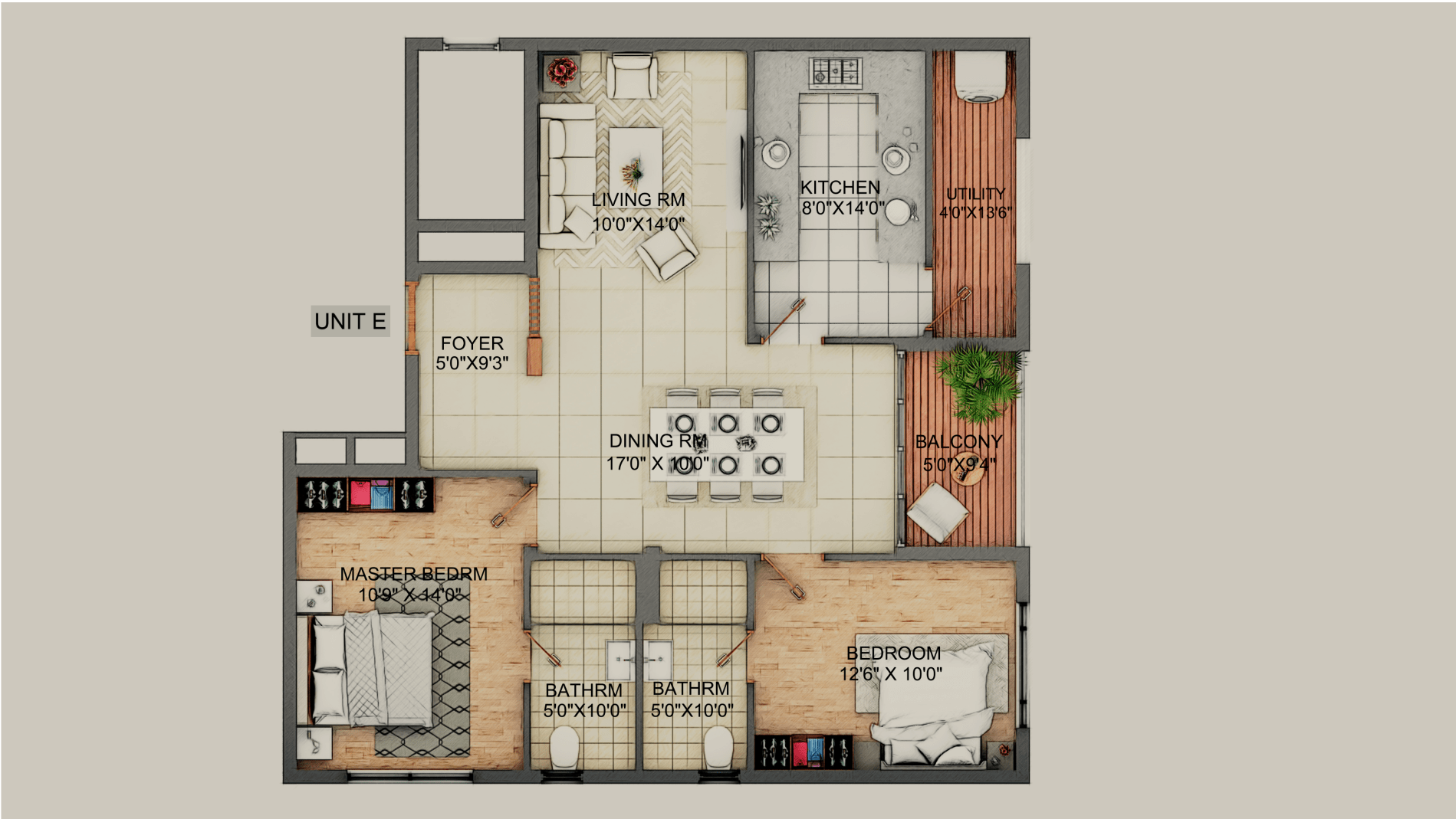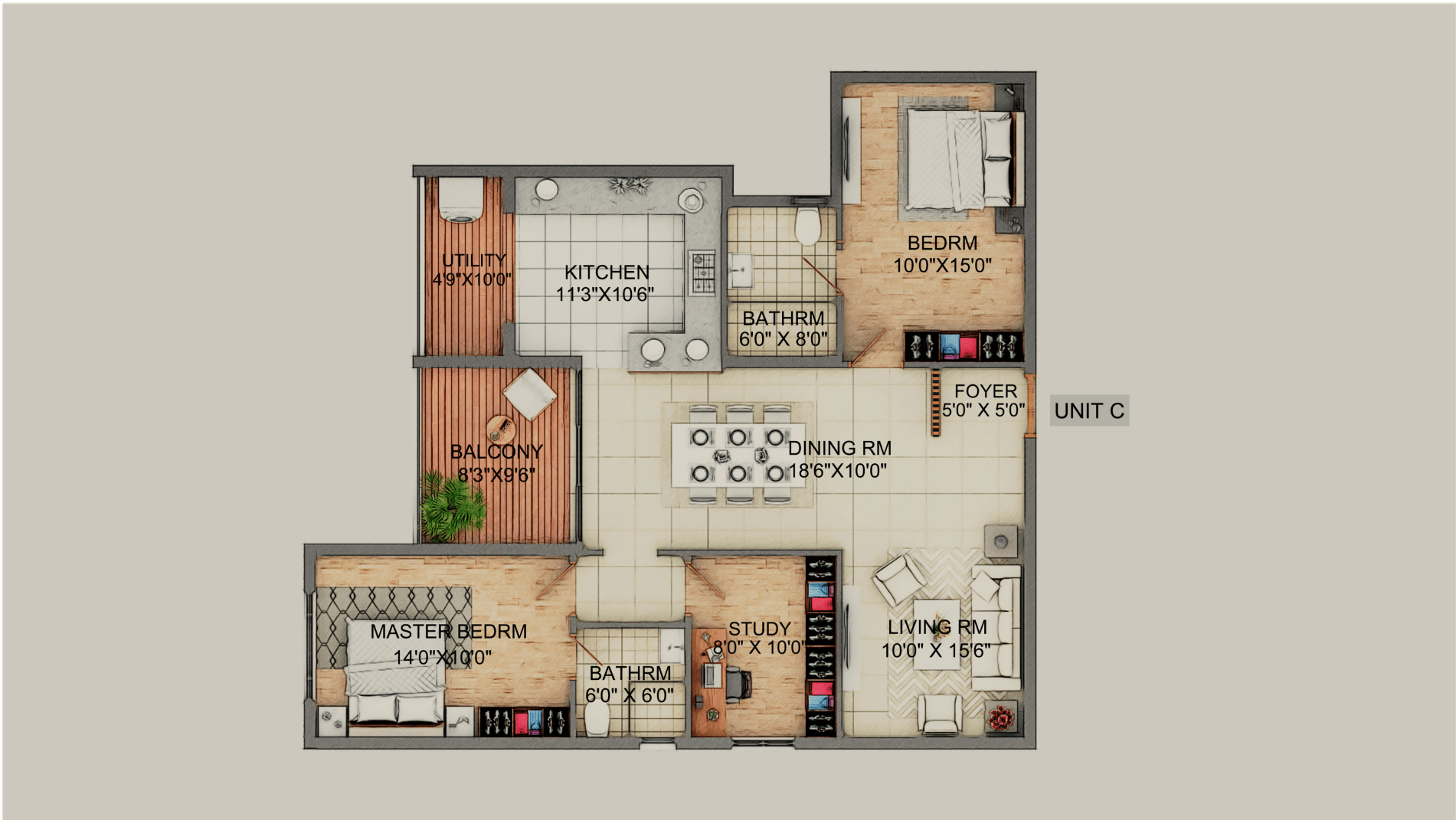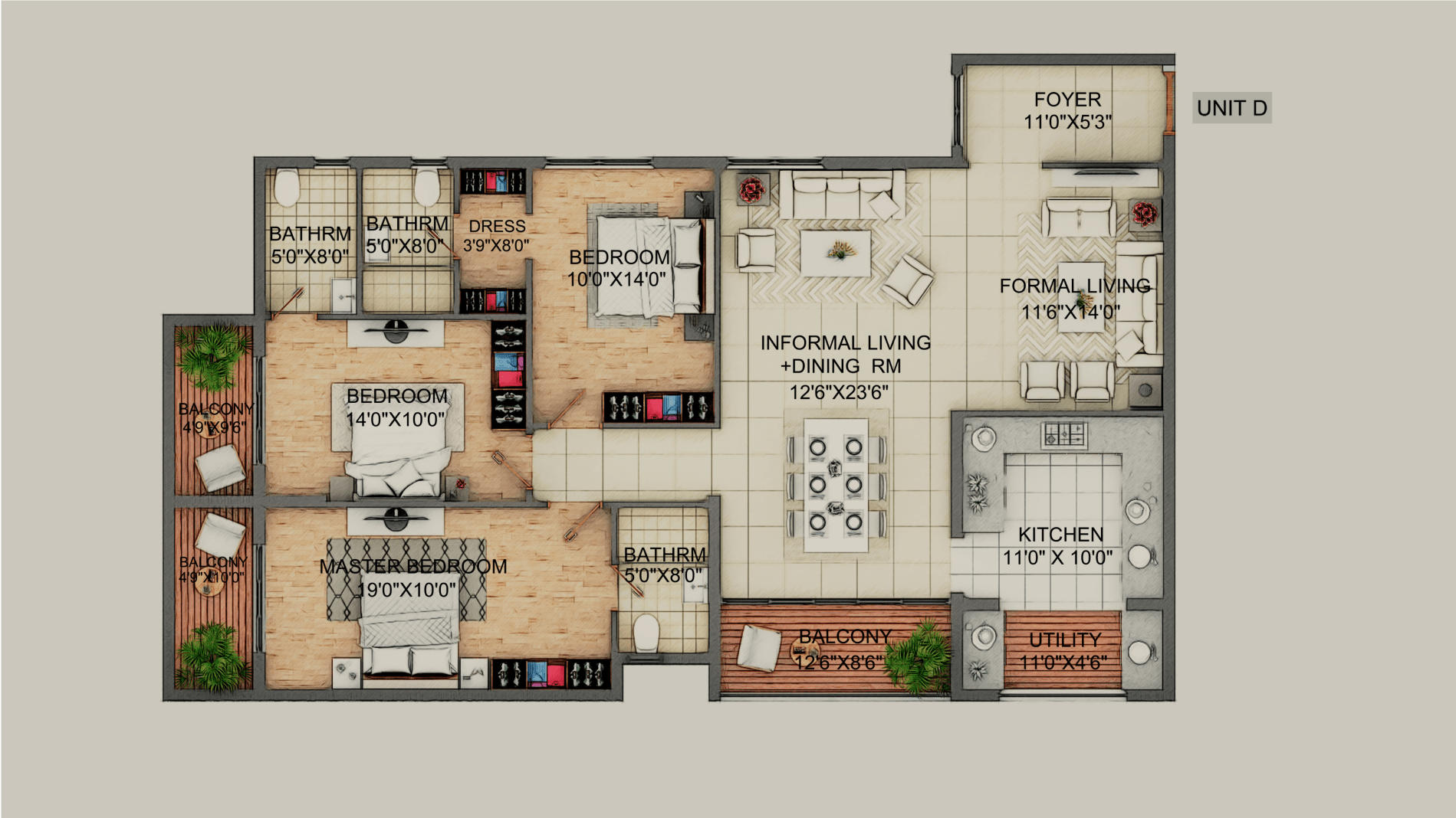 The information depicted herein viz., master plans, floor plans, furniture layout, fittings, illustrations, specifications, designs, dimensions, rendered views, colours, amenities and facilities etc., are subject to change without notifications as may be required by the relevant authorities or the developer’s architect, and cannot form part of an offer or contract. Whilst every care is taken in providing this information, the Developer cannot be held liable for variations. All illustrations and pictures are artist’s impression only. The information are subject to variations, additions, deletions, substitutions and modifications as may be recommended by the company’s architect and/or the relevant approving authorities. The Developer is wholly exempt from any liability on account of any claim in this regard. (1 square metre = 10.764 square feet). E & OE. All Floor plan caption dimensions and calculations are done in metric system (M/Sq.m), and the apartment interior dimensions and calculations are in imperial system (Ft/Sq.ft) shown is for reference only. All dimensions indicated in the drawing are from unfinished surfaces, excluding plaster thickness and tile thickness.