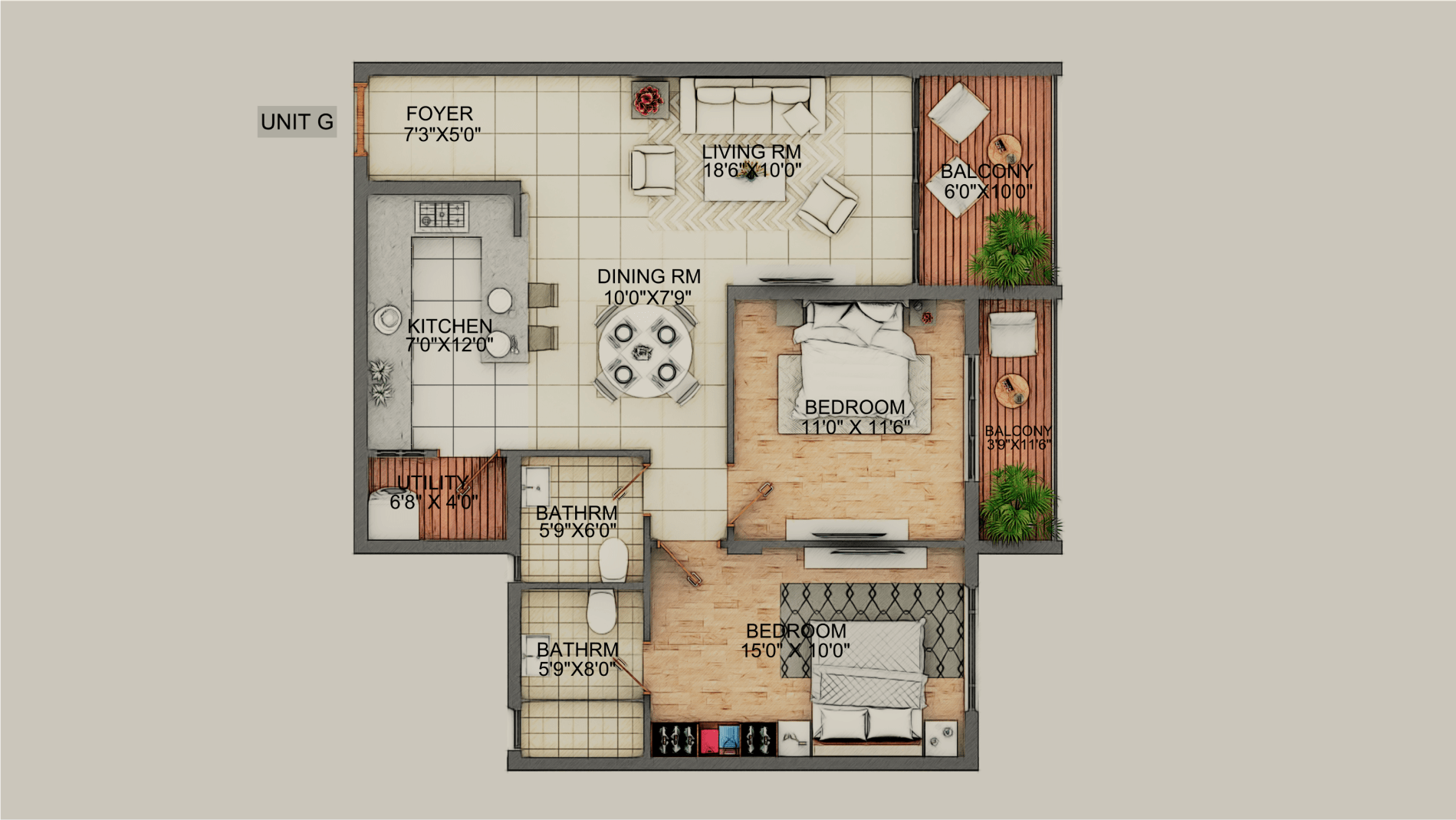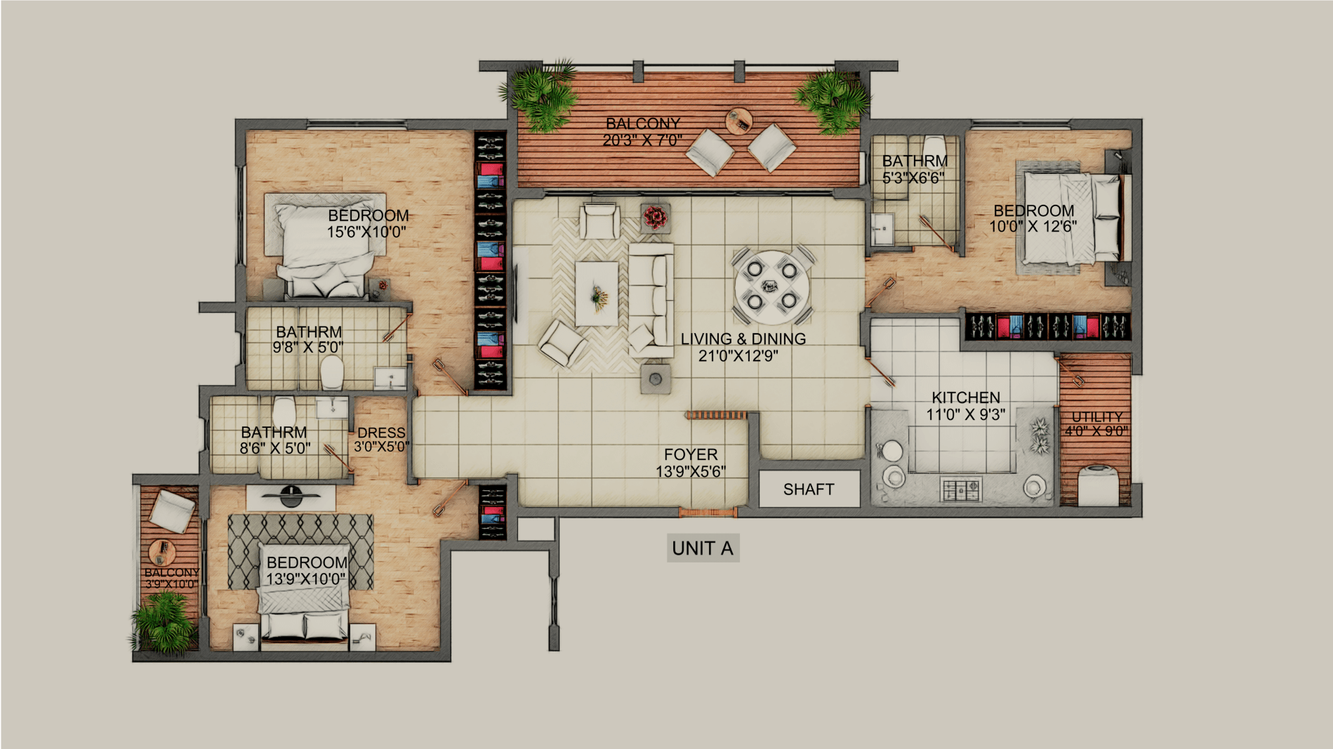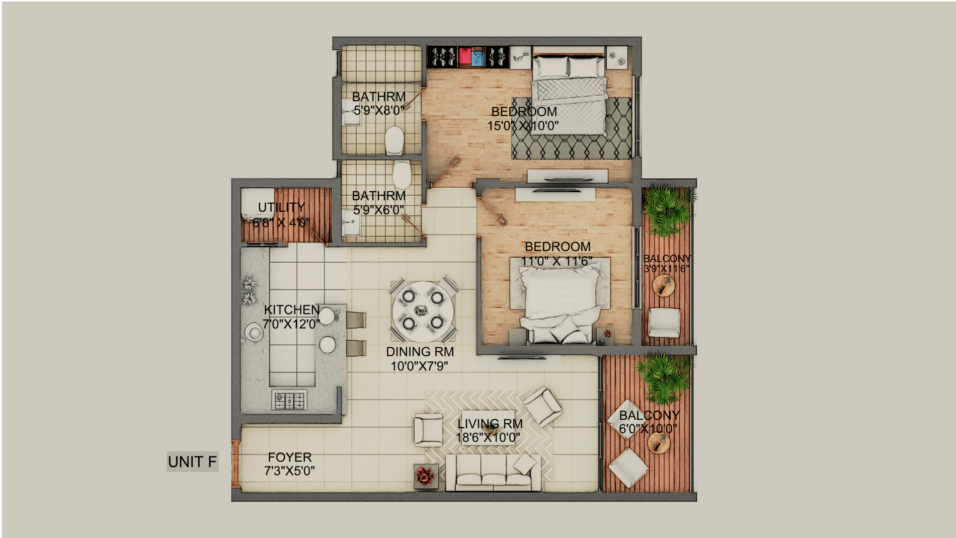 The information depicted herein viz., master plans, floor plans, furniture layout, fittings, illustrations, specifications, designs, dimensions, rendered views, colours, amenities and facilities etc., are subject to change without notifications as may be required by the relevant authorities or the developer’s architect, and cannot form part of an offer or contract. Whilst every care is taken in providing this information, the Developer cannot be held liable for variations. All illustrations and pictures are artist’s impression only. The information are subject to variations, additions, deletions, substitutions and modifications as may be recommended by the company’s architect and/or the relevant approving authorities. The Developer is wholly exempt from any liability on account of any claim in this regard. (1 square metre = 10.764 square feet). E & OE. All Floor plan caption dimensions and calculations are done in metric system (M/Sq.m), and the apartment interior dimensions and calculations are in imperial system (Ft/Sq.ft) shown is for reference only. All dimensions indicated in the drawing are from unfinished surfaces, excluding plaster thickness and tile thickness.